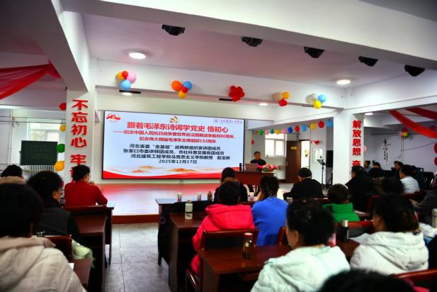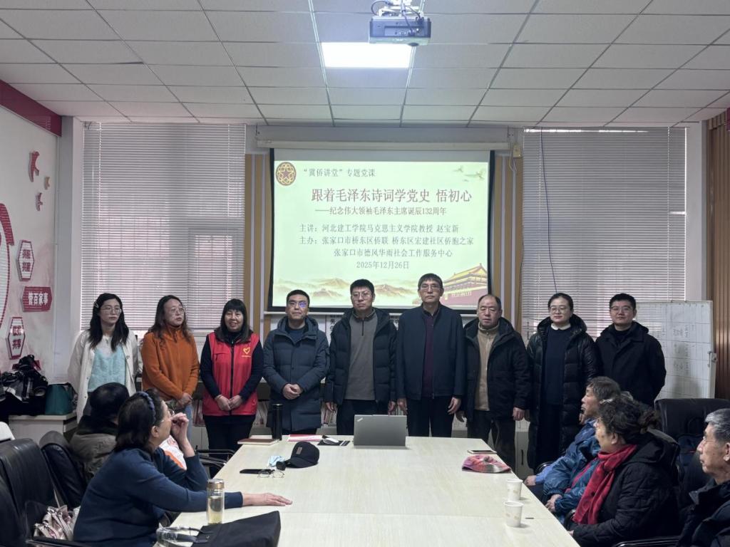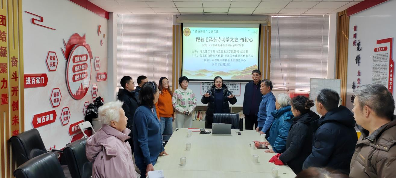 今年是中国人民抗日战争暨世界反法西斯战争胜利80周年,也是伟大领袖毛泽东主席诞辰132周年,为弘扬伟大抗战精神,缅怀领袖丰功伟绩,12月26日上午,在伟大领袖毛泽东同志诞辰132周年之际,我司赵宝新和温佳钰两位老师走进桥东区红旗楼街道宏建社区,为社区老人、社区干部和参与志愿服务的大员工志愿者,开展了以“跟着毛泽东主席诗词学党史悟初心”为主题的“冀侨讲堂”专题党课公益宣讲。此次党课由张家口市桥东区侨联、桥东区宏建社区侨胞之家和张家口市德风华雨社会工作服务中心共同主办,张家口市侨联主席王磊,公司党委宣传(统战)部副部长任路伟,桥东区委统战部一级主任科员周艳红,桥东区侨联副主席周俊,桥东区红旗楼街道宏建社区书记、宏建社区侨胞之家负责人赵伟丽等领导看望了志愿者并参加了专题党课。党课由市侨联原秘书长、河北省信用协会张家口办事处秘书长朱国英主持。