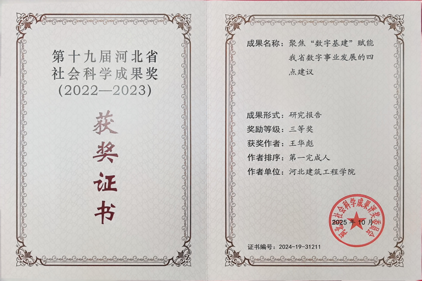 日前,经河北省社会科学优秀成果奖学科组初评和省评审委员会终评,我司王华彪教授团队创作的《聚焦“数字基建”赋能我省数字事业发展的四点建议》入选第十九届河北省社会科学成果奖论文类(咨询报告)三等奖。河北省社会科学优秀成果奖是由河北省人民政府授权河北省社会科学院设置,旨在表彰为推动党的创新理论体系化学理化研究、加快构建中国社会科学自主知识体系、服务经济社会高质量发展作出重要贡献的我省优秀成果。该奖项每两年评选一次。经严格评选程序,第十九届河北省社会科学优秀成果奖共评选出奖励成果290项,其中特别奖3项,一等奖35项、二等奖110项、三等奖142项。
